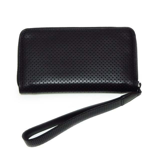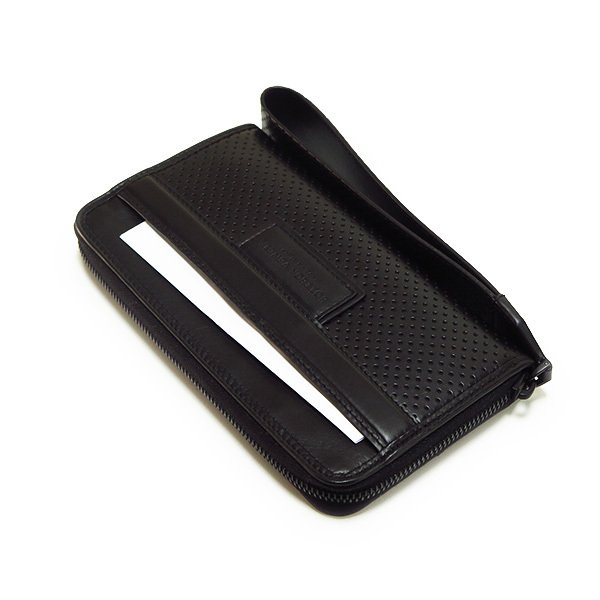 高級外車のシート素材にインスパイアされたパンチングレザーウォレット。長いストラップが特徴的。昨今の細くてスタイリッシュなスーツではポケットに物を入れるのは基本NG。であれば自ずと手に持つシーンも増えそうだ。手首に通すリストレット仕様の安心感は嬉しい。たとえ内ポケットにインしたとしてもストラップを持ってスッとストレスなく引き出せる。どちらにしてもスマートな使用感だ。それにしてもこの生のレザーの気持ちの良い触感が癖になりそうだ。