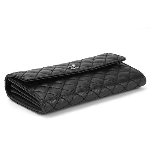 キャビアスキンのキルティングレザーと大胆な格子柄ステッチが特徴的なフラップタイプの長財布です。ポケットも豊富で使いやすい形状なので長くご愛用いただけます。