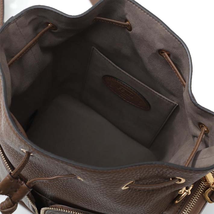 「モントレゾール」のバケットバッグ。楽に開閉できるドローストリング仕様と2つのリングパーツ、ハンドステッチのジップトップ、センターのジップファスナーデザインが特徴です。ストラップはお好みのフィット感に調節できます。