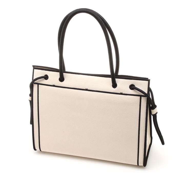 コントラストの効いたカラーで縁と大きなロゴマークの刺繍を施したトートバッグ。持ちやすく肩に掛けやすいロープのハンドルとサイドのコードがポイントに。スナップボタン仕様のポケットを備えたコンパートメントは、A4サイズが横にぴったり収納できます。ポンと置いても倒れない自立タイプは、幅広いシーンで活躍します。