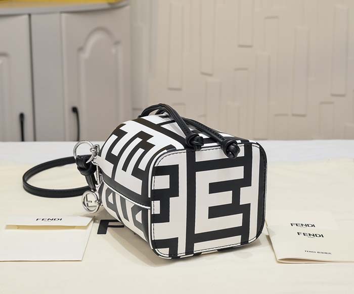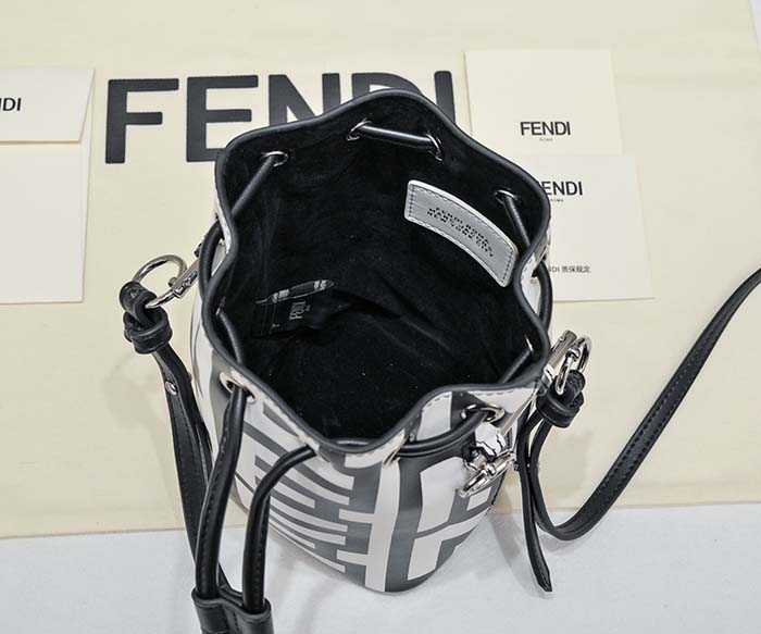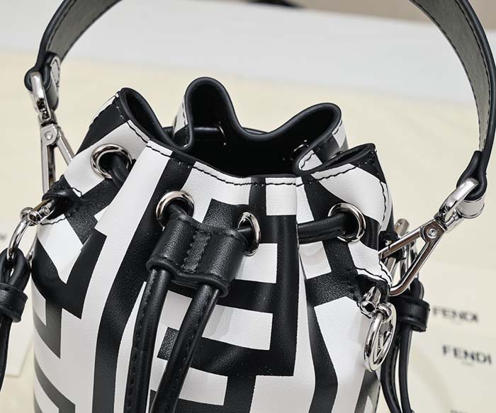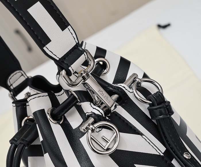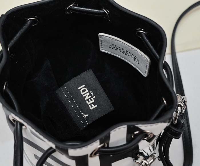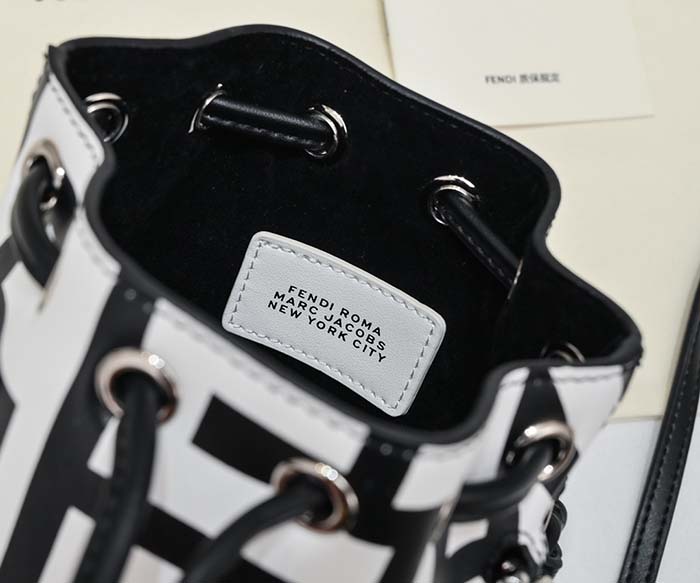 スモールサイズのモン トレゾール バケットバッグ。FENDI by MARC JACOBS限定コレクションのアイテム。ホワイトのレザー製。立体感のあるFENDI ROMAのレタリングをキルティングであしらったデザイン。