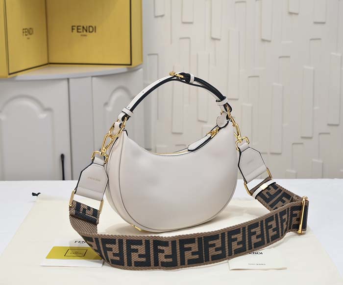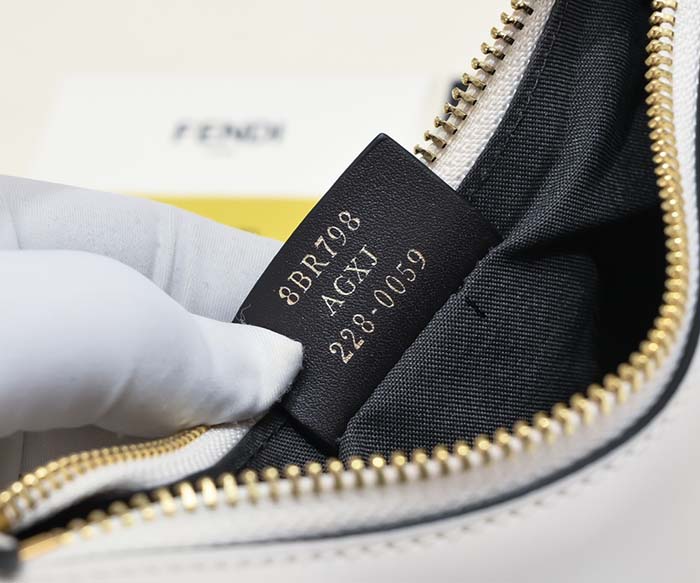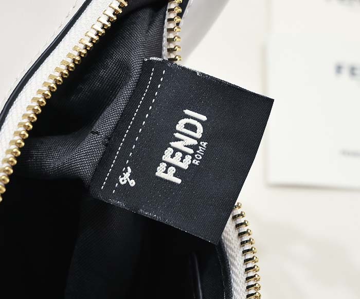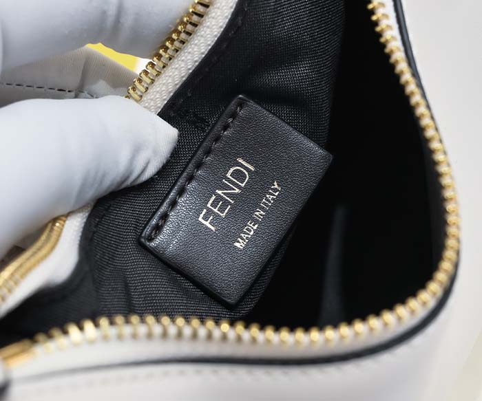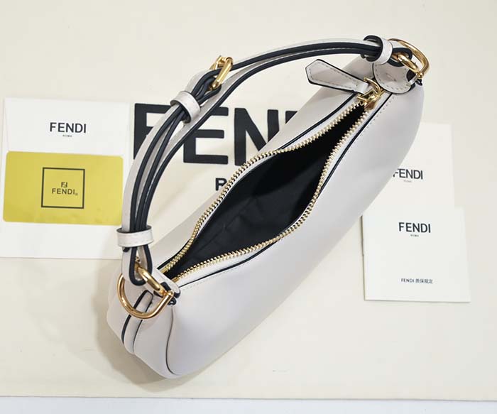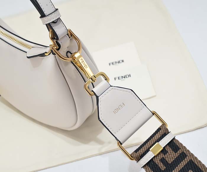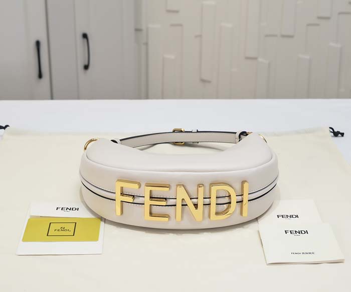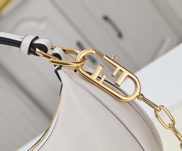 ホワイトの柔らかなレザーを使用し、ヴィンテージゴールドに輝くメタルのFENDIレタリングをあしらった、ミニサイズのホーボーバッグ。