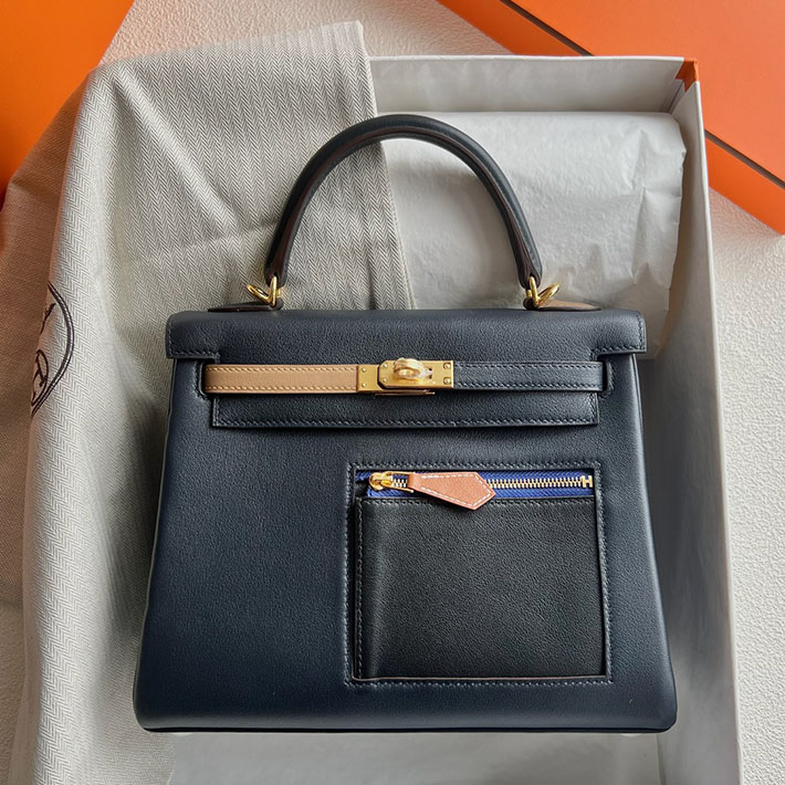 HERMES Kelly25 Color matic Bleu×Black×Chai×Etoupe×Gold Swift Gold Buckle 【NEW】