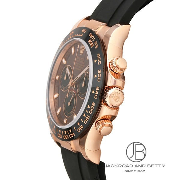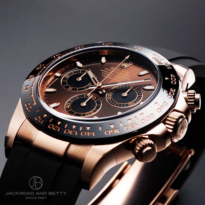 クロノグラフの定番モデルとして当店でも根強い人気を誇るロレックス コスモグラフ デイトナ。エバーローズゴールドケース専用色となるチョコレート(ブラウン)×ブラック文字盤には視認性に優れた3カウンター(スモールセコンド、30分計、12時間計)のクロノグラフが備わっています。