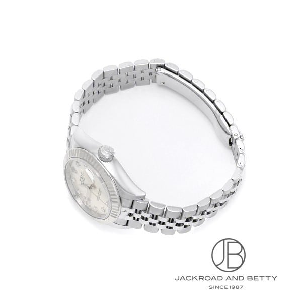 こちらはレディ デイトジャストの現行モデル(発表されている最新型番)。ステンレス×ホワイトゴールドベゼルの通称ロレゾールとシルバー文字盤は、上品な印象でどんなシーンにも合わせやすく、当店で最も需要の多い人気の組み合わせになります。