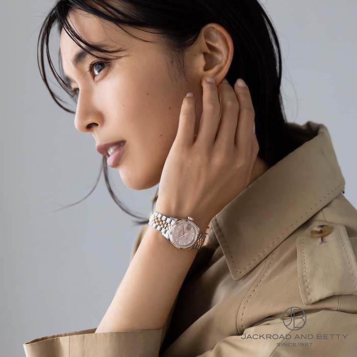 ロレックスのデイトジャスト28です。 2016年に発表されたケース径28mmの新型モデル279171Gです。 素材にはロレックス独自のエバーローズゴールドとステンレスを使用。ブレスレットもしなやかな構造になりました。 2021年発表のロゼカラーダイヤルに9Pのスターダイヤインデックスと9時位置に大きく配置されたローマ数字にもダイヤをあしらった、新しいロレックスを印象付けるモデルです。